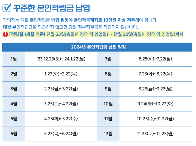 계좌를 개설할 때 입금을 시작해야 합니다. 최소 금액은 월 10만원이며, 최대 50만 원까지 입금 가능합니다. 더 많이 저축할수록 정부의 매칭 기부금과 은행 이자 혜택을 더 많이 누릴 수 있다는 점 아시죠.
