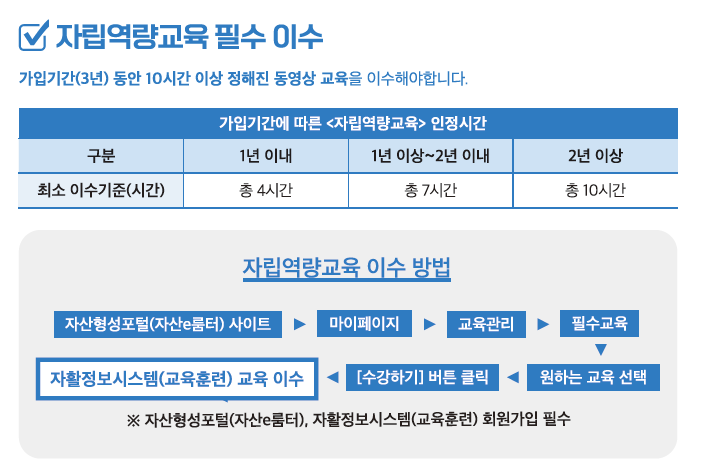 마지막으로 약간의 교육 이수가 필요합니다. 자산형성포털사이트를 통해 자립역량훈련 10시간을 이수해야 합니다. 대부분 비디오 기반이므로 일정에 쉽게 맞출 수 있습니다. 이 교육은 돈을 현명하게 관리하는 방법을 확실히 알려주는 것입니다. 큰 성과를 거둘 수 있는 간단한 금융 지식 강좌라고 생각하세요!